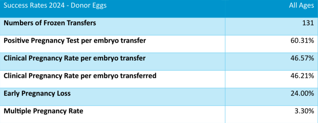 As the age of the egg at collection can impact on the success of the treatment, we have excluded cases where donor eggs were used in treatment from the general data presented in this leaflet, as it would otherwise give a misleading impression of higher success rates. Below we present separately our data regarding egg donation and its outcomes at our Clinic.