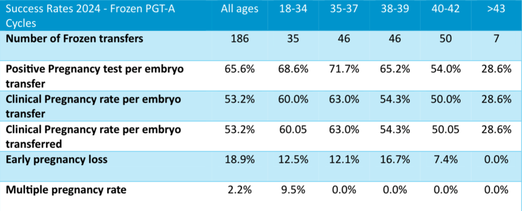 The Human Fertilisation and Embryology Authority (HFEA) classes PGT-A (pre-implantation genetic testing for aneuploidy) as a treatment add-on. This means that there is not enough evidence to show that it is effective at improving the chances of having a baby for most fertility patients. Whilst PGT-A does not carry any additional known risks for the person undergoing fertility treatment, it is known to carry some risks for the embryo. As a result of the existing scientific uncertainties, and unless otherwise clinically indicated, PGT-A is not routinely used in treatment for everyone at our Clinic. This is why cases where we have performed PGT-A are excluded from the general data presented in this leaflet, as it would otherwise give a misleading impression of higher success rates.