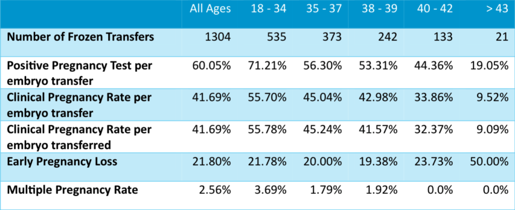 The graph and tables below show the chances of a clinical pregnancy following a frozen embryo transfer cycle (FET). This is based on the age of the egg at the time it was collected and then frozen – not at the age the patient was when they had the transfer.
