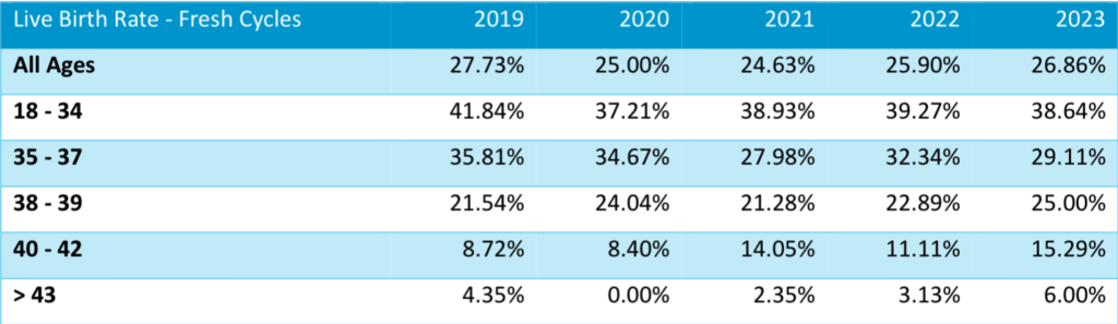 The table below shows the live birth rate that resulted following a fresh embryo transfer cycle. Please note that we have also included the percentage of data that we are missing, due to patients being ‘lost to follow-up’ and therefore being unable to verify the live birth data. These cases are automatically classed as ‘negative for live birth’, even if a baby has been born as a result of our treatment.