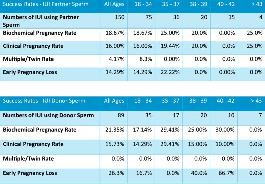 The table below shows the chances of each of the outcomes that resulted following an IUI cycle in 2022 and whether the patients used partner or donor sperm.